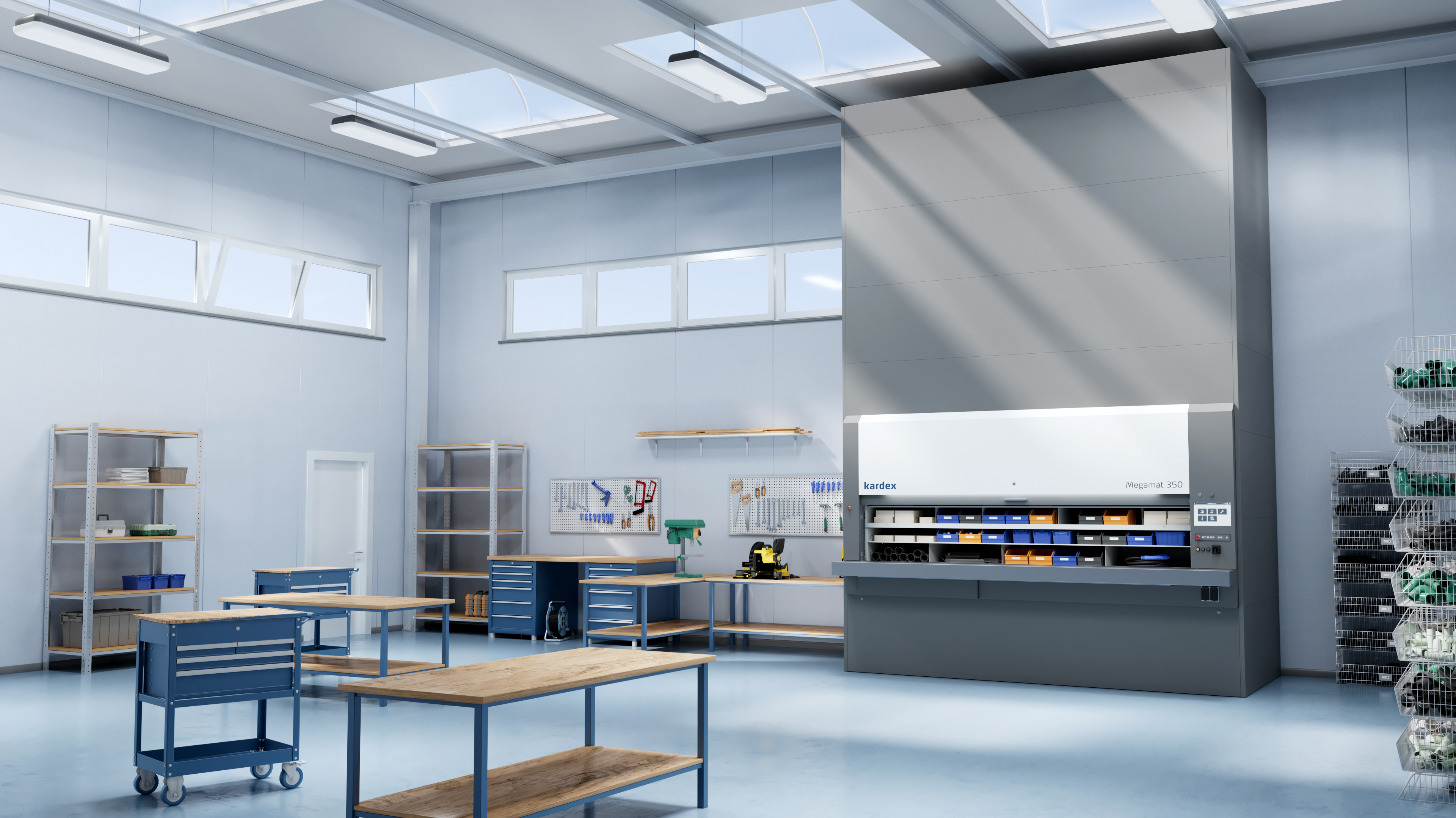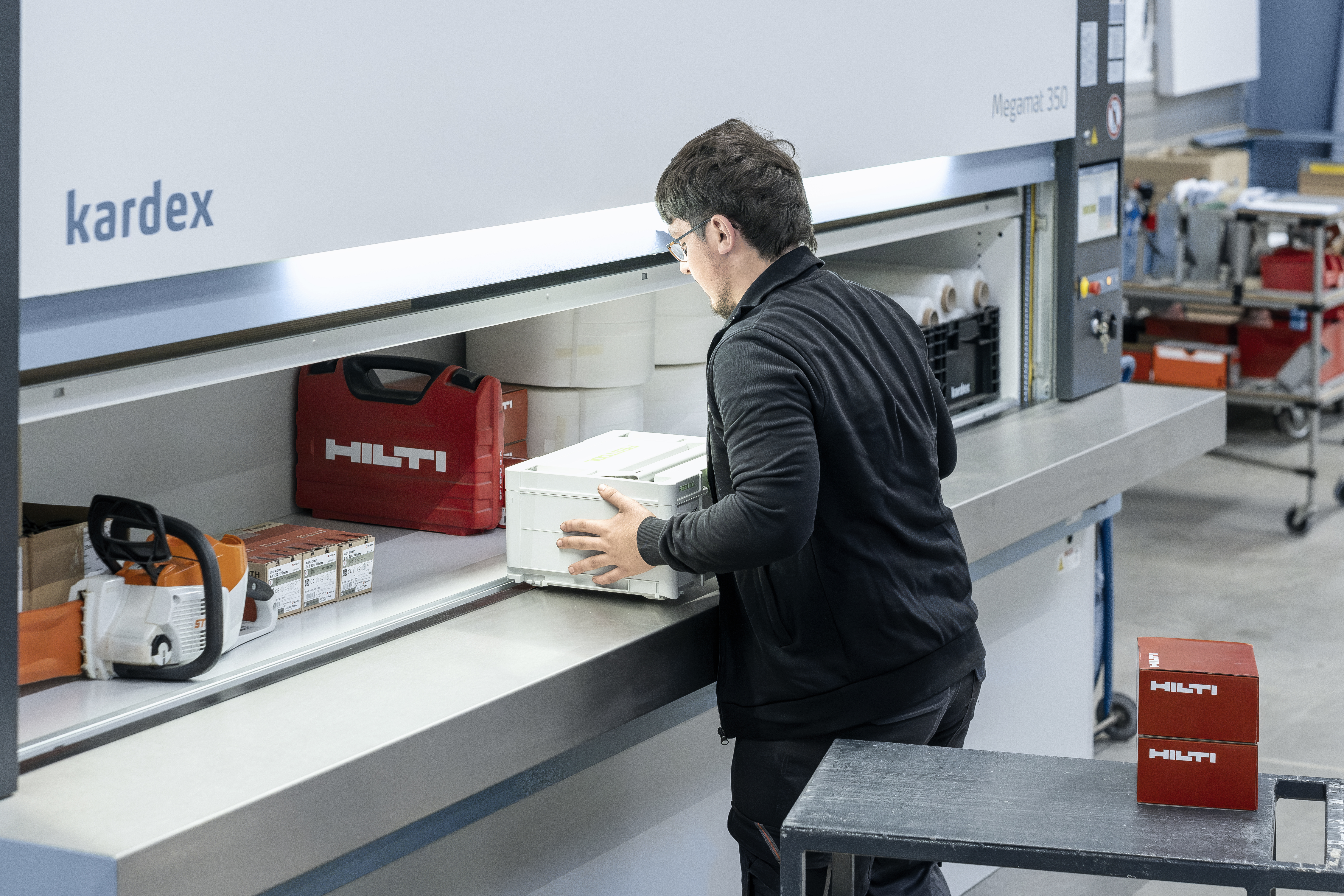 Der Kardex Megamat Essential nutzt ein Paternostersystem: Kleine Schrauben, Zubehör und selbst größere Werkzeuge werden in rotierenden Trägern gelagert. Kein Laufen, kein Suchen – mit einem Knopfdruck kommt alles direkt zu dir.