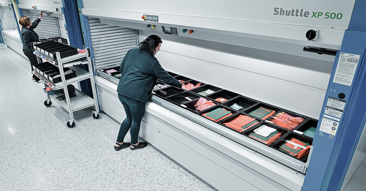 - Vertical Lift Modules (VLMs) – An enclosed automated storage and retrieval system that consists of two columns of trays with an inserter/extractor in the center. The inserter/extractor automatically locates and retrieves stored trays from both columns and presents them to the operator at a waist-high pick window, eliminating travel and SKU search time.